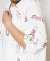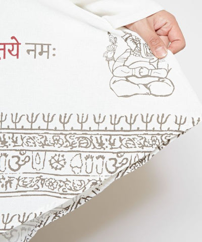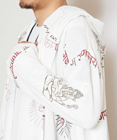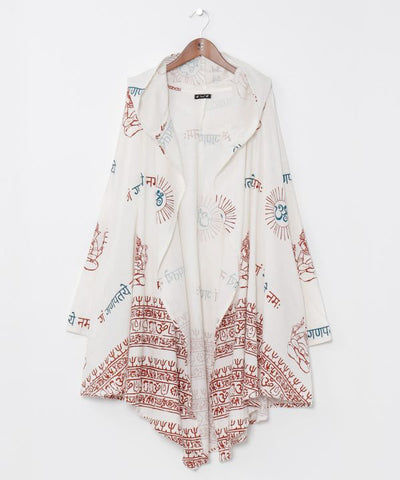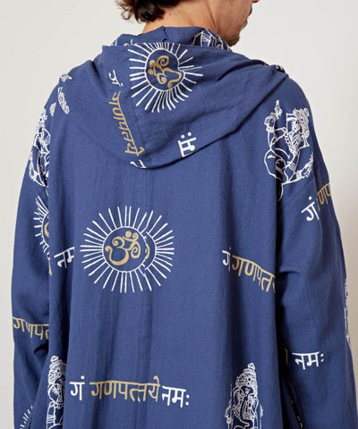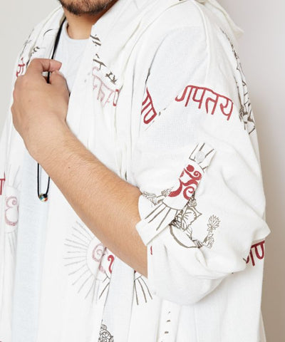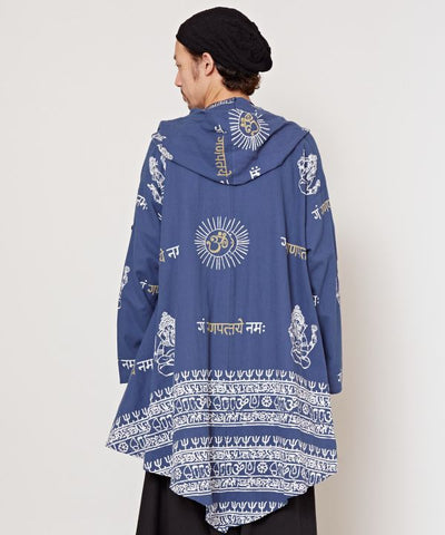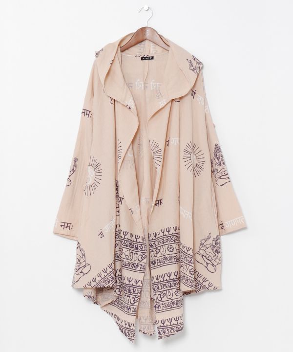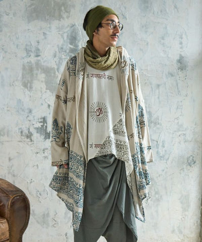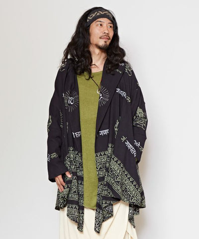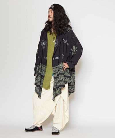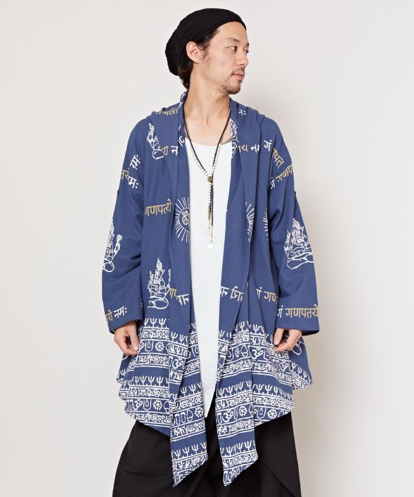 A slouchy shaped men's cardigan that shines with individuality. Made of comfortable Indian cotton, you can enjoy a silhouette like no other. Roll up the sleeves and tabs on the inside allow you to adjust the sleeve length. Pockets on both sides. The mantra is said to bring success to your efforts if you recite it when starting something new.