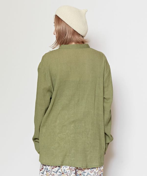 This top is inspired by the traditional Indian kurta. The thin crepe material allows for stress-free wear. Richly decorated with rakhnou embroidery, a traditional Indian craft.