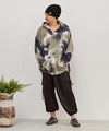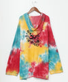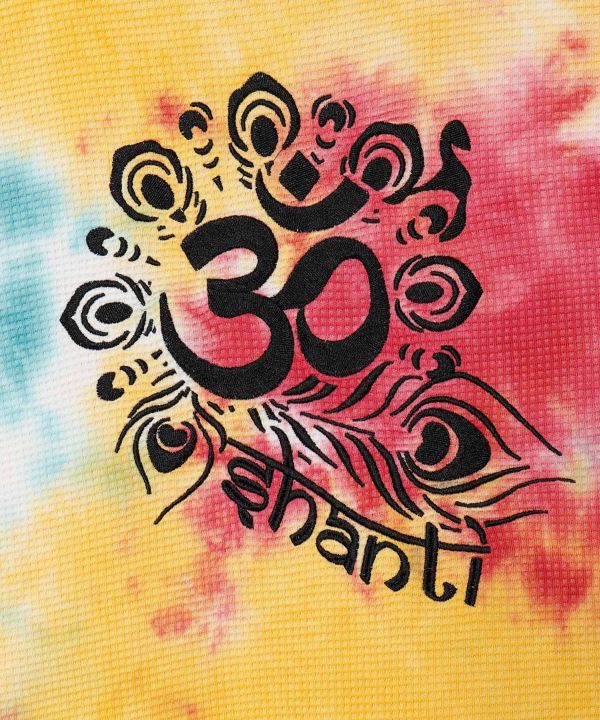 Tie-dye top with a strong presence just by wearing it/ Loose-fitting oversized/ Comfortable and comfortable waffle material with a relaxed feel/ Rough and casual style/ The theme is "Holi," a Hindu spring festival in which people express joy by pouring colorful powder and water on each other/ The embroidery on the back is a Krishna motif with a peacock element because the Holi festival is related to the Krishna legend. Shanti is a Sanskrit word meaning "peace" "tranquility," or "serenity". The embroidery on the back is a Krishna motif with a peacock element, as the Holi festival is also associated with the Krishna legend / "Shanti" is a Sanskrit word meaning "peace," "tranquility," or "serenity," and was chanted as a mantra with the word "aum.,