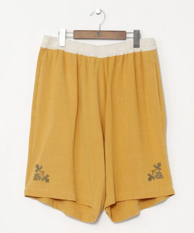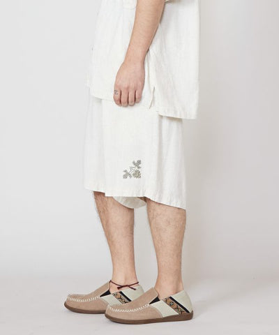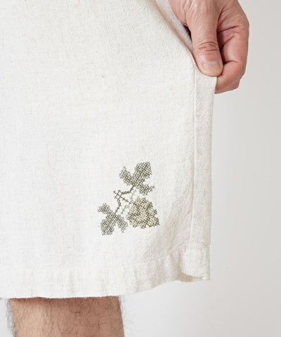Amina x grn x Yokohama Beer Collaboration Project. These men's half pants feature cross-stitch-style embroidery of wheat and hop motifs which are ingredients of beer. The soft linen blend material and elastic waist make these pants light and comfortable to wear. The pockets on the side and back also make this item highly functional.