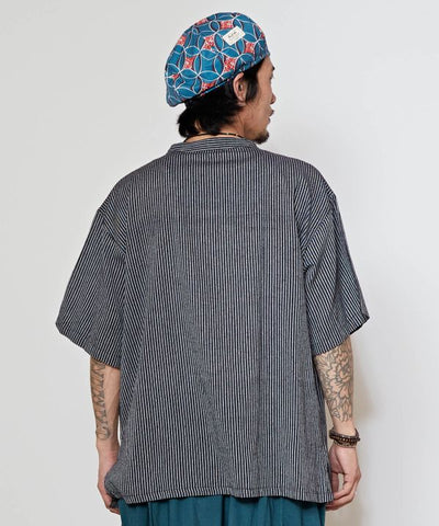 Basic men's shirt with stand collar. Woven striped fabric with a textured look and feel made of Nepalese cotton that becomes more comfortable the more you wear it. Chest pocket.