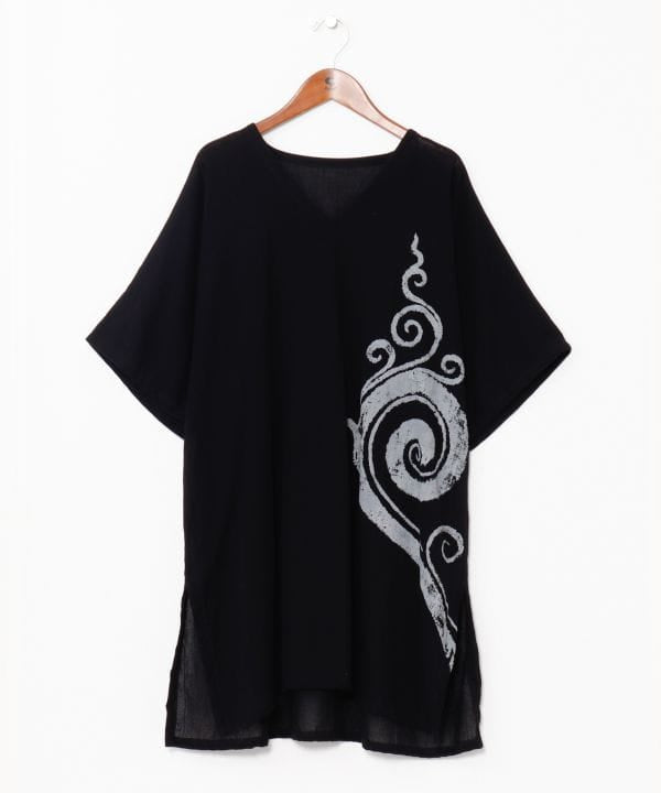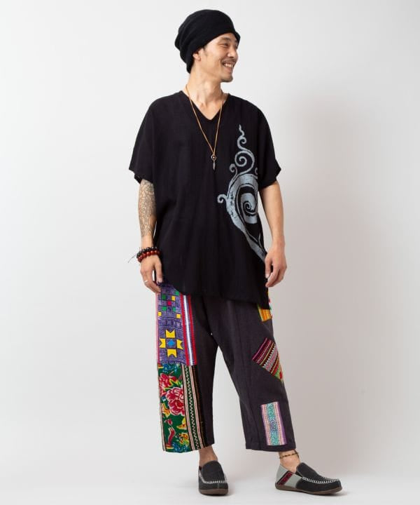 Carefully curated in Thailand. An oversized men’s top made from textured cotton fabric. Deep side slits enhance movement and pair well with voluminous bottoms. The bold print adds visual interest while maintaining a relaxed, minimal feel. A versatile piece that combines comfort with subtle cultural design elements.