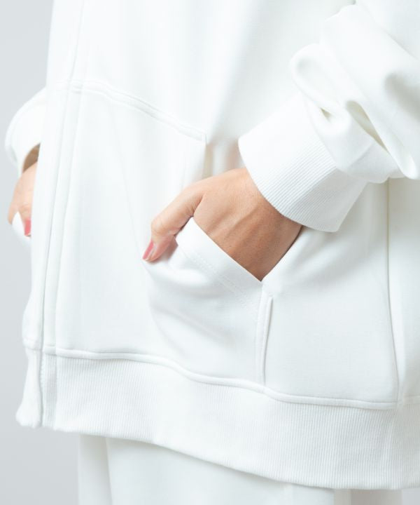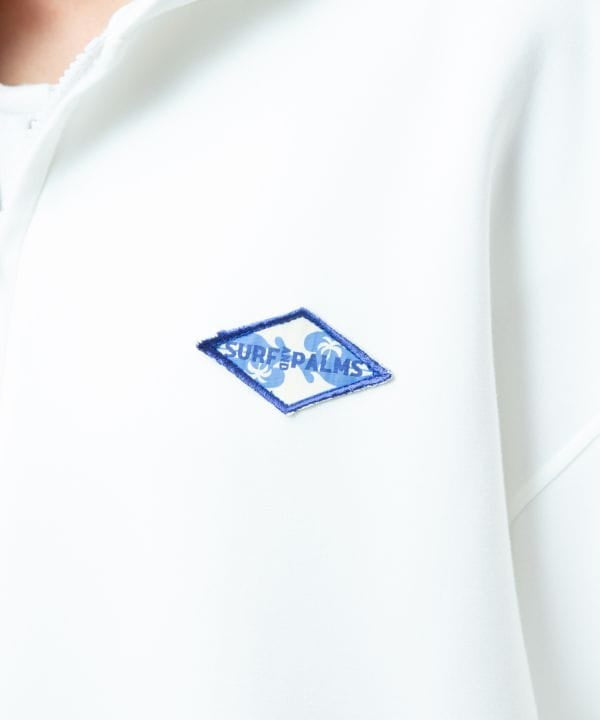 This men's zip parka is made of a comfortable cardboard knit material. The three-dimensional brush embroidery on the back gives it a strong presence, making it a simple yet impressive design. Its lightweight and soft comfort makes it perfect for a relaxed style. It is also a great piece to wear with half pants or pants as a set-up.