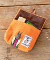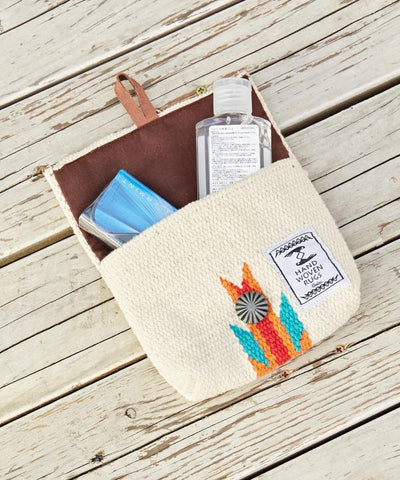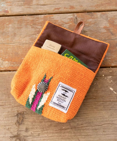 Pouch with a design inspired by the Native American and made of rustic textured rug material. The concho button is a design point. The size is just right for a variety of items. The sturdy rug fabric is resistant to losing its shape and will be by your side for a long time.
