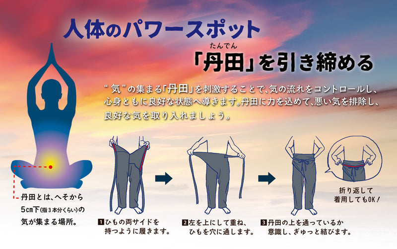 The more you wear them, the more comfortable they become. Easy pants with a light texture made of Nepalese cotton. It is said that tightening the tanden, located approx. 9cm the navel, has the effect of tightening the qi that gathers in the body. The color scheme of the folded-over portion adds an accent.