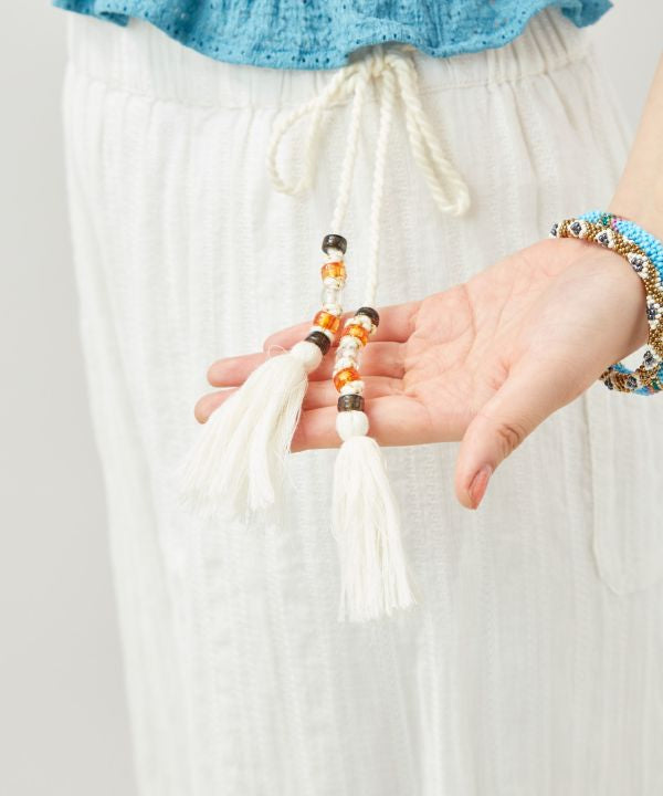 Luxurious pants with patchwork of lace fabric. The large tassels and beads placed on the side of the waist are also a key point. A simple but meticulous piece that will add color to your outfits.