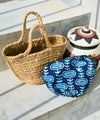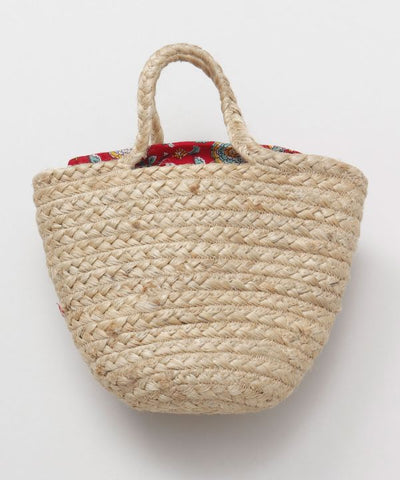 Small handbag made of jute with a round shape. The zipper pouch is detachable with a button, so it can be used alone. The block print texture is rustic and cute.