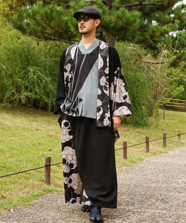 This men's top is made of cotton material that feels comfortable against the skin. It is boldly decorated with auspicious patterns such as the bundle of noshi coins (tabane-noshi) fans, and treasure bags, and has a glamorous look that will bring good fortune to the wearer. The design of the matching collar gives it a kimono-like appearance, and the loose silhouette makes it easy to move around in. It is a modern Japanese top that is easy to incorporate into everyday life.