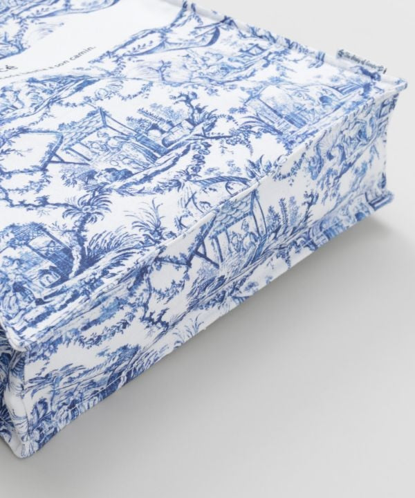This large tote is inspired by the toile de Jouy produced in the Jouy region outside of France in the late 18th century. Each color is accompanied by a French proverb, bringing art and philosophy to your travels and daily life. It can also be worn over the shoulder. Made of organic cotton.