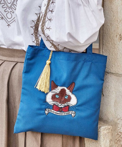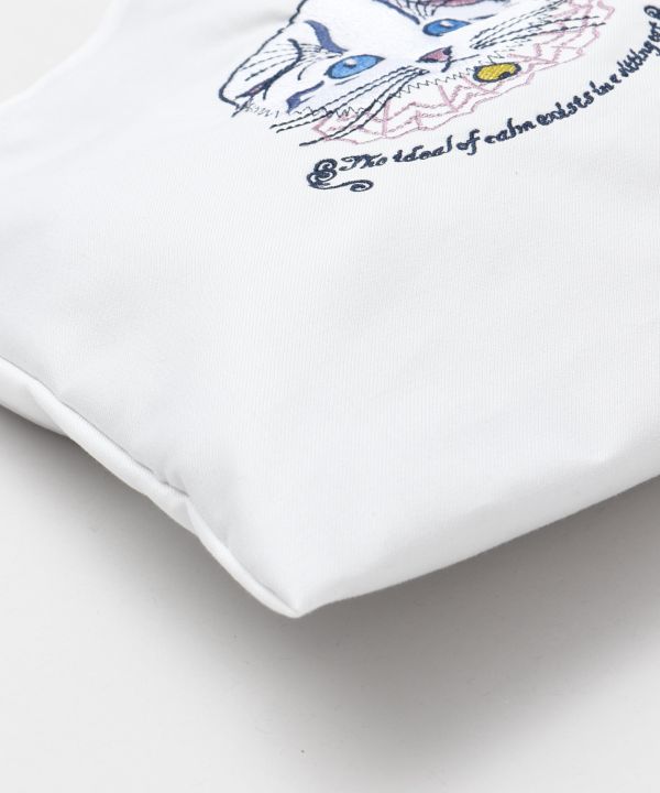 A handbag with a cute cat with a dressed-up, sophisticated face. The cats embroidered on the bags are cats born in Europe. The English text on each bag is inscribed with words related to cats written by great European figures. It is perfect for a quick trip with a cell phone or mini wallet. Despite its clean silhouette with no gussets, an A5 size notebook or a pen case can fit in here as well. With an inside pocket. The mischievous design is irresistible to cat lovers, and will unintentionally bring a smile to your face!