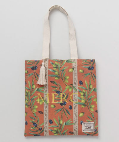 This olive-patterned tote bag is inspired by Provence fabrics. It has a wonderful vintage look and feel. Accented with tassel charms on the handles, it can hold an A4-size bag vertically. With an inside pocket. Made of organic cotton.