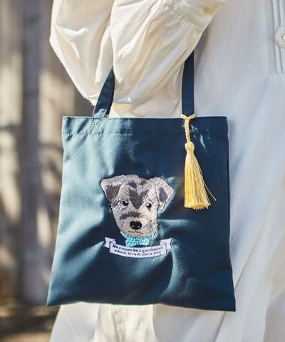 A small bag with an adorable design of cheerful puppies. The embroidered designs are of dogs born in Europe. The English text on each dog is inscribed with words related to dogs written by great European figures. It can also be used for a quick trip with a cell phone or mini wallet. Although it has a clean silhouette with no gussets an A5 size notebook, a pen case, etc. can be securely placed in it. It comes with an inside pocket. The mischievous design is irresistible to dog lovers and will unintentionally bring a smile to your face.