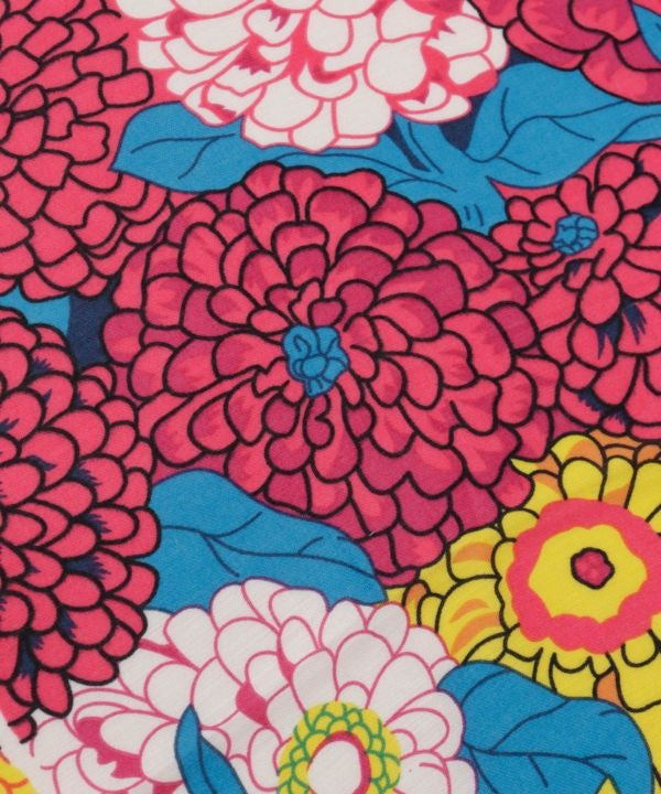A large-sized stole featuring vibrant flowers depicted in full bloom. Delicate lines harmonize with bold colors creating an instantly glamorous impression when worn. This oversized stole also serves as sun protection or a shield against air conditioning, offering versatile styling options—draped over shoulders or wrapped around the neck. It modernizes the beauty of Japanese flowers, making it a timeless piece to enjoy year-round.