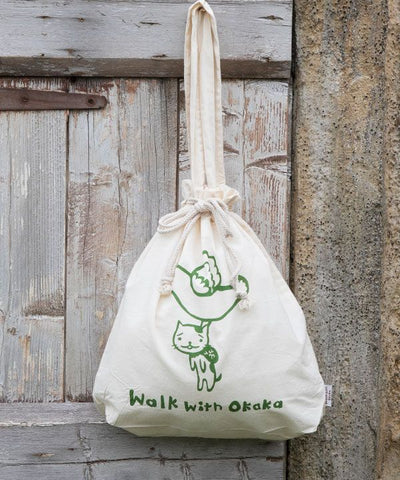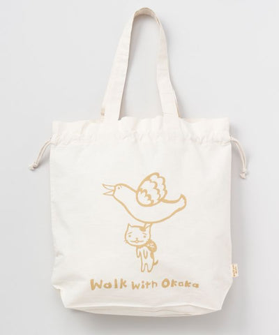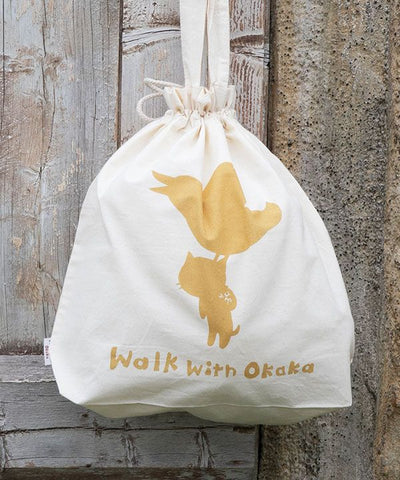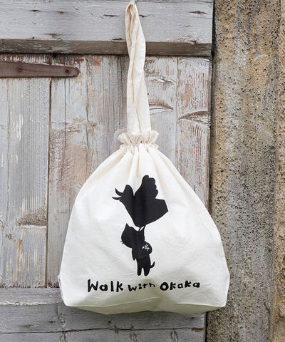 A cotton tote bag that can be squeezed like a drawstring. Natural cotton material. One side has a silhouette of an okaka, and the design can be enjoyed on both sides. With a gusset, you can hang it on your shoulder, making it useful for shopping, small outings, or as a sub-bag. It is thin, so it is not bulky when placed in a bag. The monochromatic color that matches with any coordinates is also a key point. Let's go out together with Oka heel.