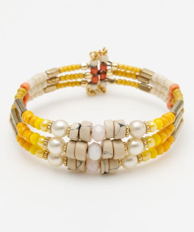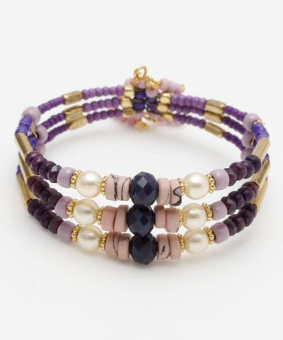 Easy bangles in a variety of exotic and rich colors. The center bead and pearl beads are the key points of this 3-strand type. Color it your own way with different base colors to create different impressions.