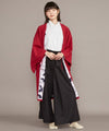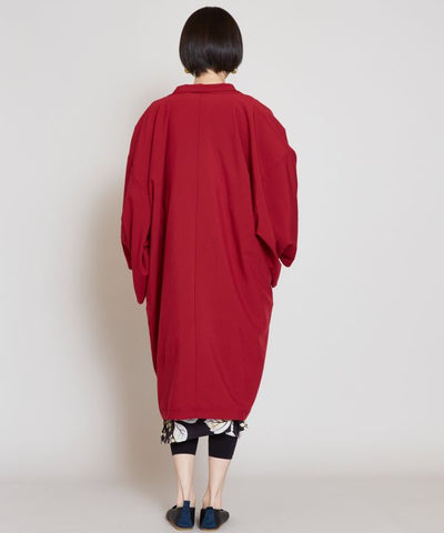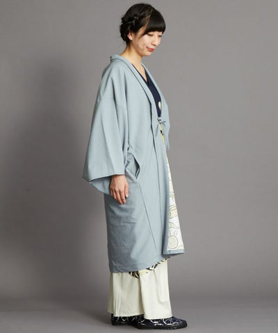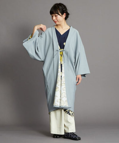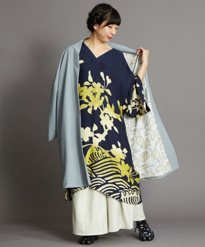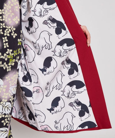 This Haori is a Kimono-like coat redesigned with dogs, cats, and rabbits depicted in ukiyoe woodblock prints. The "urakatsuri" style, in which a more luxurious lining than the outer fabric is concealed, was created in response to the prohibition of luxury issued in the Edo period. The surface of the well-tailored fabric is a plain color that is easy to wear. This series allows you to enjoy the hidden fashion inside. The simple shape is suitable for both men and women. You can tie the strings attached to the front collar to wear it neatly. With side pockets.