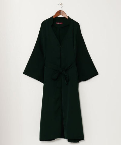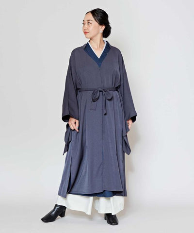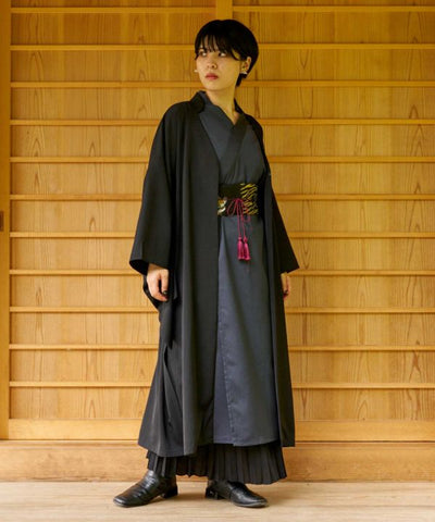 This kimono-like haori has a shape modeled after traditional Japanese clothing and is designed with the utmost in simplicity. The key point is the original embroidery with the image of a pine tree as a back protection. Match it with a kimono-like dress to complete a classy Japanese style coordinate. With pockets on both sides.
