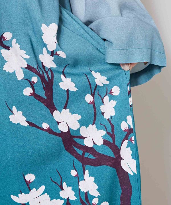 A cache-coeur type long kimono haori. The boldly arranged plum blossoms and light colors give it a spring-like appearance. It can also be worn as a kimono-like dress by tying the strings and matching an obi. The rayon material is cool and comfortable to wear even on hot days and the UV-protection finish is ideal for protection from the sun.