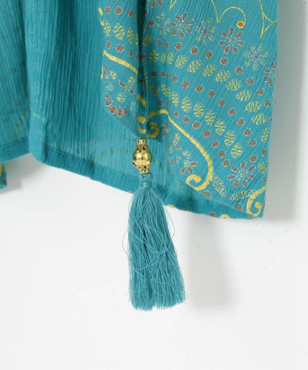 Cardigan with UV protection treatment in a design inspired by stained glass patterns. The bright colors are inspired by stained glass. The fabric is rayon crepe, which is lightweight and cool, making it a great choice for strong sunlight.
