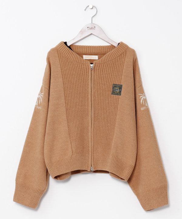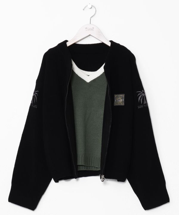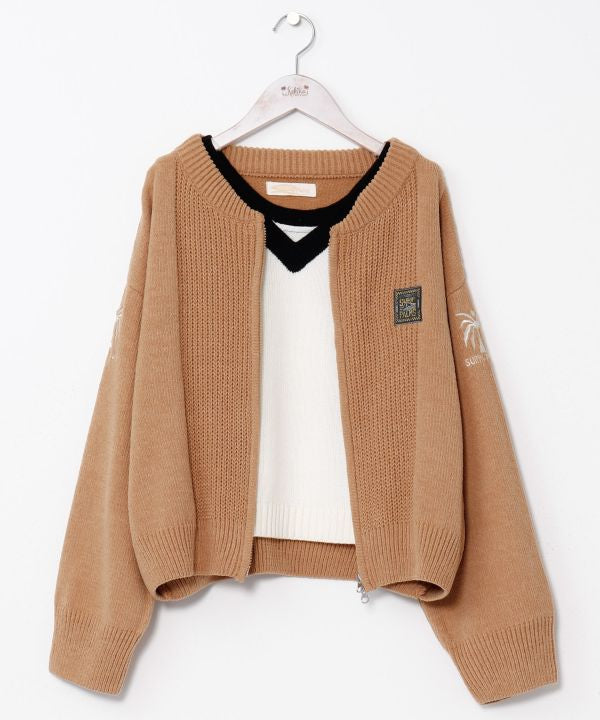 A soft and comfortable knit cardigan and tank top set item. The tank top can be worn either front or back for a wider range of coordination. The sleeves of the cardigan are embroidered with a palm tree.