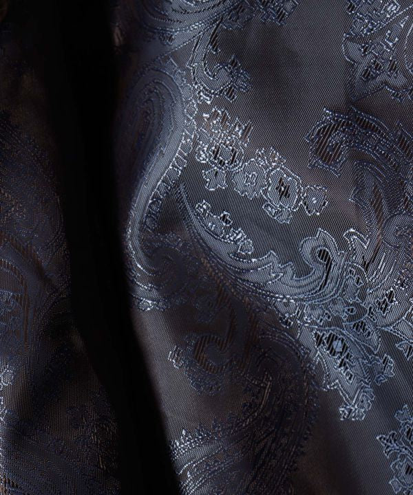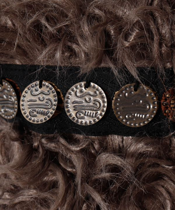 This jacket is made of comfortable poodle fur fabric. The glossy paisley pattern lining adds to the luxurious feel. The front closure has metal hooks and a zipper. A coin charm on the tape section adds an accent. This item is inspired by the fur winter wear worn by Tibetan nomads.