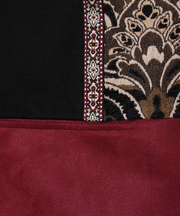 A patchwork outerwear made of different materials: lined wool jacquard, and cut suede. This item is a cross between a trench coat and kimono detailing, with the theme of "civilization opening". The wide cuffs can be adjusted with a drawcord. Even the back style is a piece filled with attention to detail.