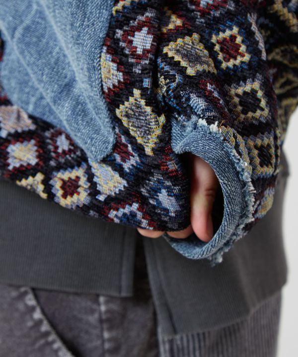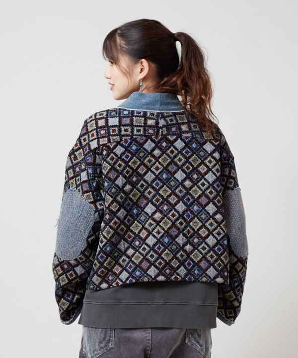 The combination of denim and jacquard fabrics different materials, makes this cardigan very attractive. The relaxed body width and short length make this piece easy to match with a variety of coordinates. The pattern motif is a Kilim pattern called "devil's eye," which means "repelling evil. The denim portion is washed and the edges are cut off to give it a vintage look. It is an item that has its own individuality.