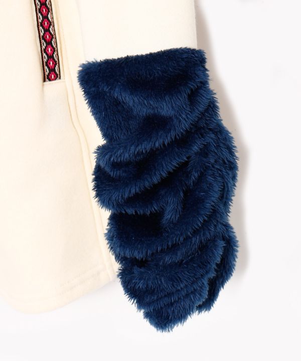 This hooded jacket has a unique rounded shape and gathers at the sleeves. The boa patchwork and Tyrolean tape add a unique accent. The front opening uses metal hooks for easy on/off. The warm lined fabric can be worn alone, and the color palette is inspired by the brightly colored scarves of Central Asia.