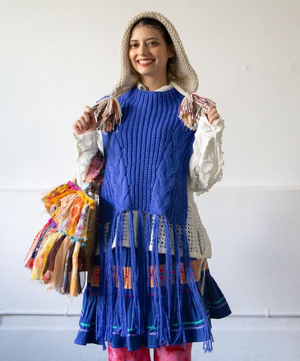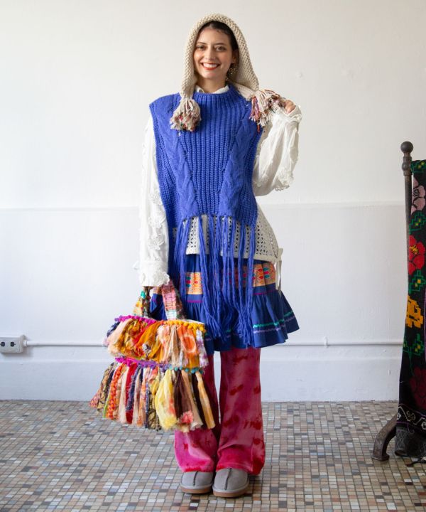 A style enhancing effect for sure. This fringed knit vest has a stand collar for warmth around the neck. The diagonal patterned knit is a key feature of this item, which is ideal for layered coordinates.