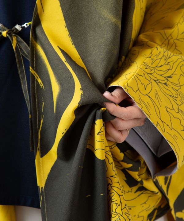 Japanese-inspired haori with bold peony and ink-wash patterns. Furisode-inspired silhouette with open underarm sleeves revealing inner fabric color. Luxurious drape and easy-care polyester material.