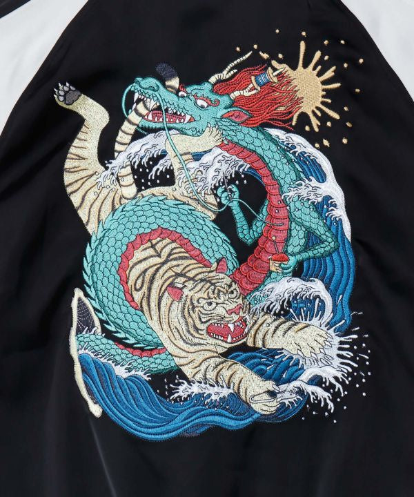 Kaya x Suzuki Hyottoko collaboration project. Collaboration Jacket. A collaborative piece with artist Suzuki Hyottoko captivatingly depicting the fusion of tradition and modernity. Features an original "Dragon and Tiger" embroidery design on the front and a full-pattern design motif of "Bountiful Catch" on the reverse, making it reversible. The design, inspired by the collar area of traditional Japanese attire, adds an elegant impression, while the smooth feel of the satin fabric is also appealing. This unisex piece effortlessly creates a Japanese-modern style, pairing well with denim, dresses, and more, transcending traditional Japanese or Western fashion boundaries.