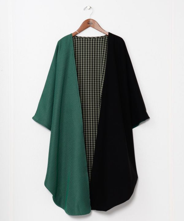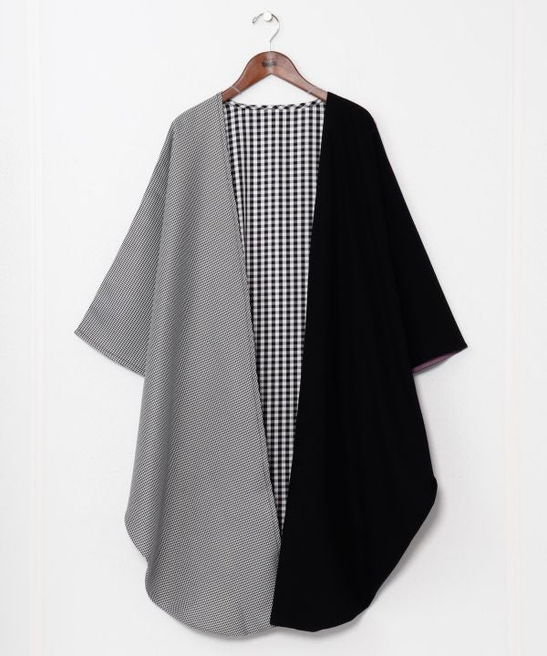 A furisode haori featuring Showa-era modern and Moga (Modern Girl) themes. Its design combines furisode motifs with check, houndstooth, and solid fabrics. This contemporary Japanese haori offers a glamorous yet composed impression, perfect for pairing with dresses, accessories, and hats.