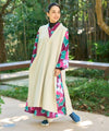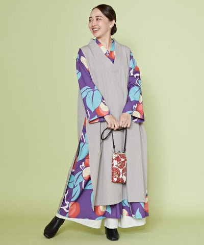 This set-up dress expresses the Meisen pattern, a Kasuri technique popular from the Taisho to Showa periods, in a modern Japanese color combination. The deep slits on both sides allow the vivid pattern of the inner one-piece to peek out. Each piece can also be worn separately for a wider range of coordination.
