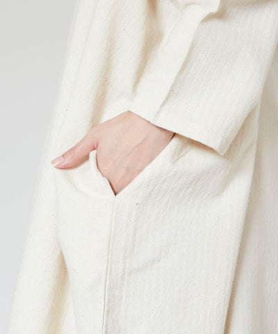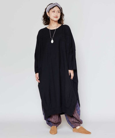 This dress is made of Nepalese cotton with a texture that becomes more familiar the more it is worn and has outstanding softness. The unique chest pocket is a key feature. The lotus motif on the back, one of the eight auspicious symbols, signifies purity and innocence. With the wish that you can enjoy your journey with a cloudless mind. A piece that can be worn with ease and basics.