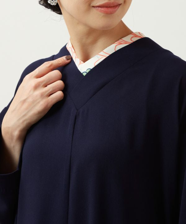 The Hakkake dress features a beautiful floral pattern that can be glimpsed when walking. The collar looks like layers of a kimono giving you a Japanese look just by wearing one piece. The relaxed silhouette makes it perfect for any body type. The front is plain, so it is easy to wear, and the modern floral pattern like chiyogami seen through the back seam and collar gives it a subtle Japanese look.