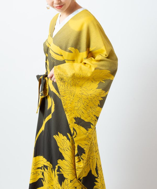 Japanese-inspired dress featuring peony and ink-wash motifs. Furisode-inspired silhouette with draping fabric, adjustable waist tie, and versatile styling options. Easy-care polyester material suitable for pairing with obi belts or other accessories.