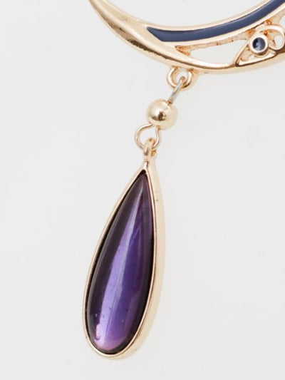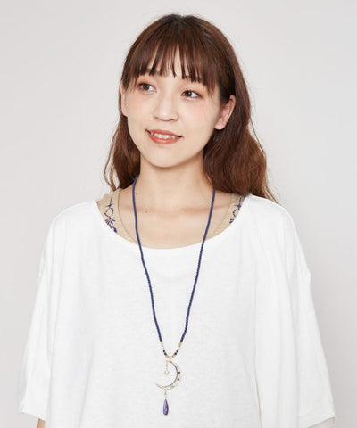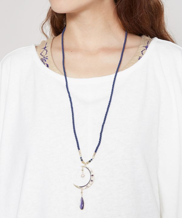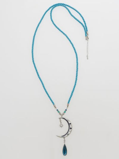 This feminine necklace combines a moon motif with the sun. The colors shine through brightly when the necklace is exposed to light creating a fantastic effect. The large motif necklace is a great accent to your coordinate.