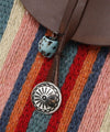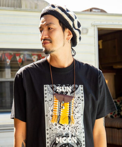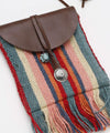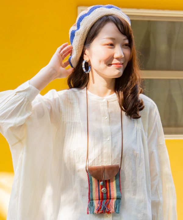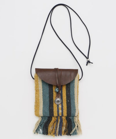 Colorful woven fabric pouch necklace. The slightly vertical and thin pouch comes with a concho button and one point turquoise-like piece. Convenient for holding small accessories, wireless earphones, etc. This necklace is lightweight and can be used as a single point of attachment.