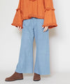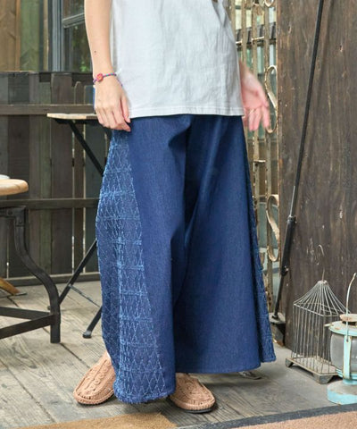 Hippie-style bootcut denim pants. Made of patterned denim with a damaged finish. The basic design makes these pants a versatile item for all occasions. The elasticized side waist allows for loose fit.