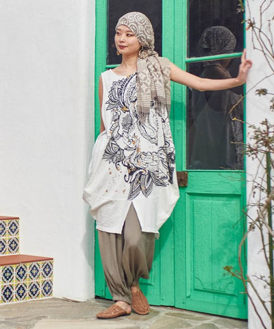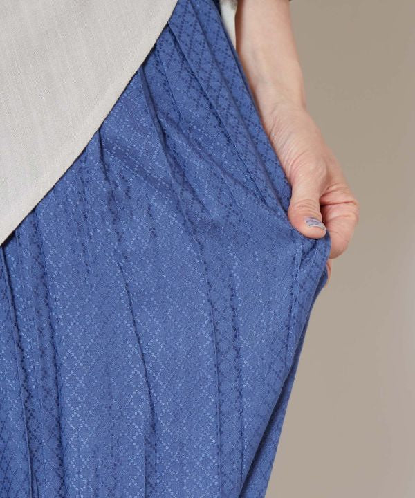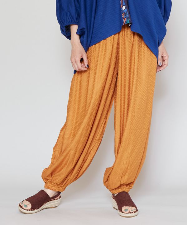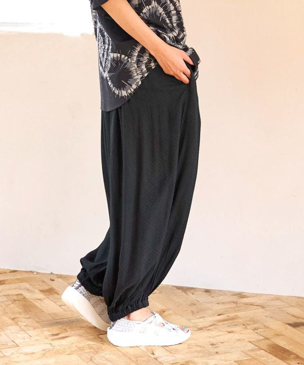 These elegant relaxed pants have a beautiful flowing drape. The rayon dobby material with a plaid pattern gives these pants an attractive silhouette with a sense of ease. The relaxed volume and simple design will surely be useful in a variety of situations. The elastic at the hem allows you to adjust the length at will.