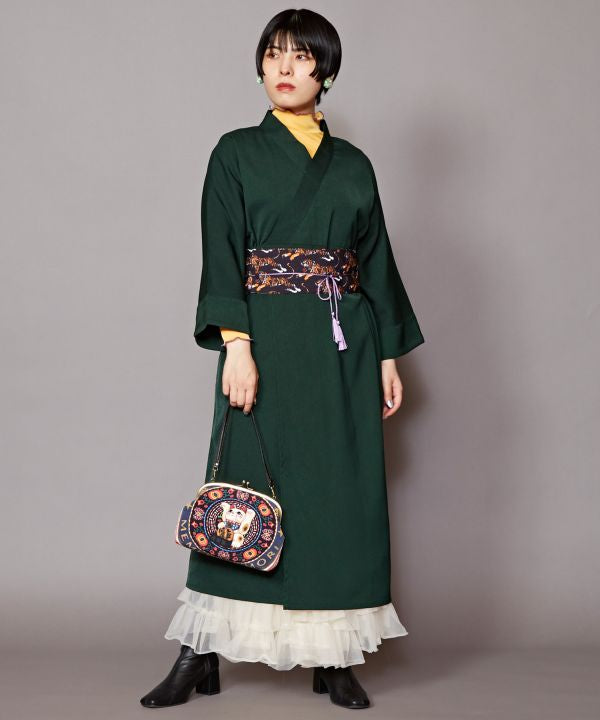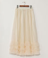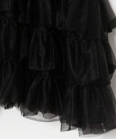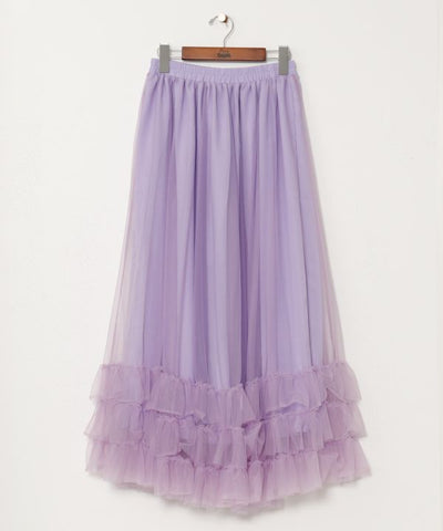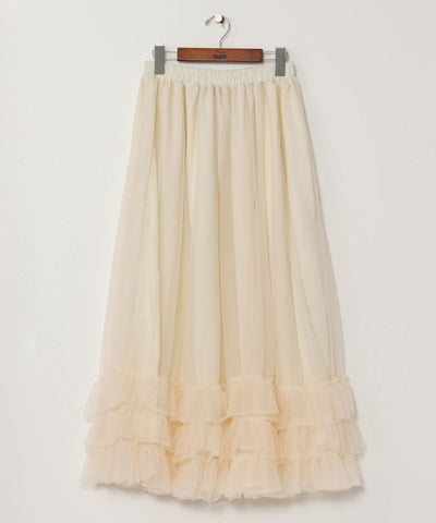 This skirt is made of soft tulle. The hem is layered with ample ruffles to create a voluminous piece. It offers a new modern Japanese style by combining it with kimono or kimono-like dresses. This dress also works well as a color accent to coordinate. Elastic waistband. Lined.