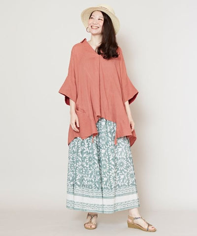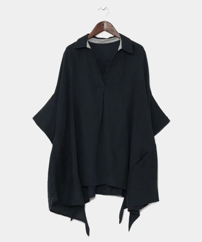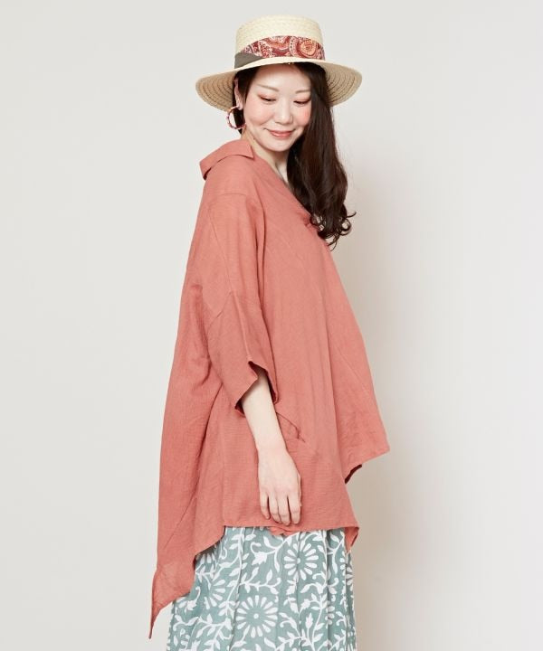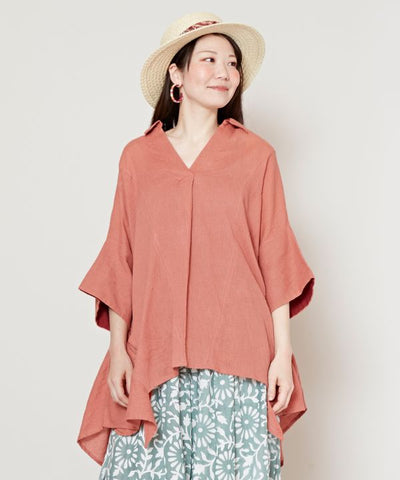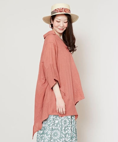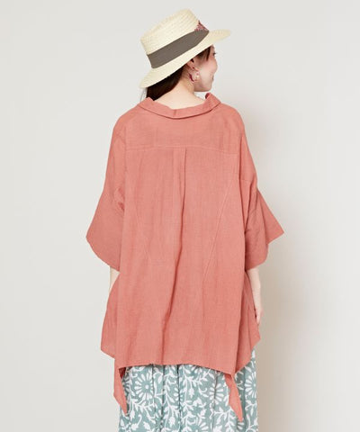 A shaped top with a pleasantly soft hue. The Indian cotton material with a slight surface texture creates a casual look. The playful one-point color scheme on the back of the sleeves and the deformed silhouette of the hem make it fun to coordinate. With side pockets.