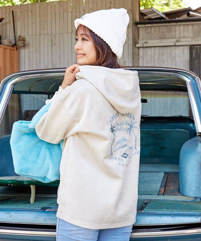 This faux suede hooded top is soft and light to the touch. The back features bold embroidery of palm and wave patterns that evoke a Hawaiian scene. One point at the end of the hood ties.