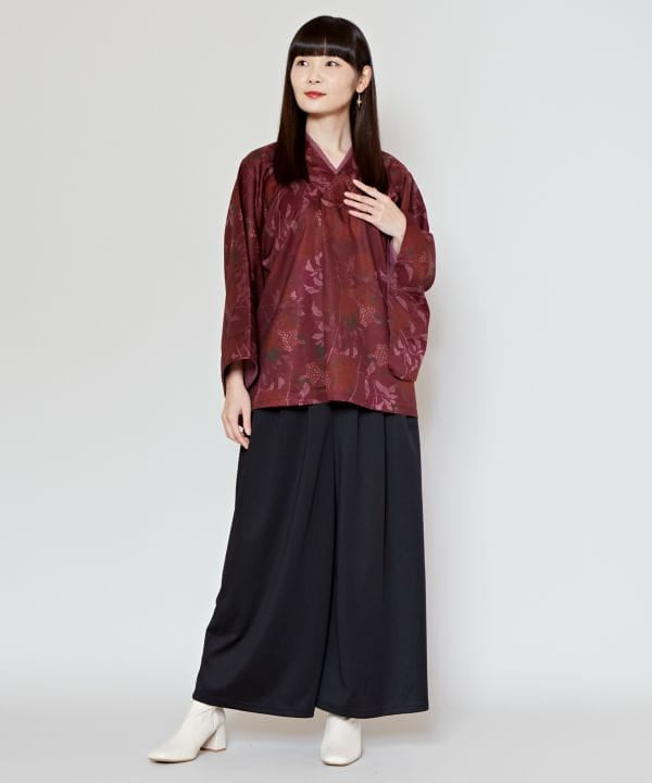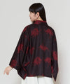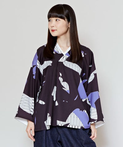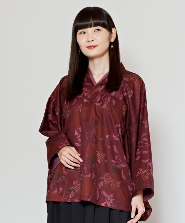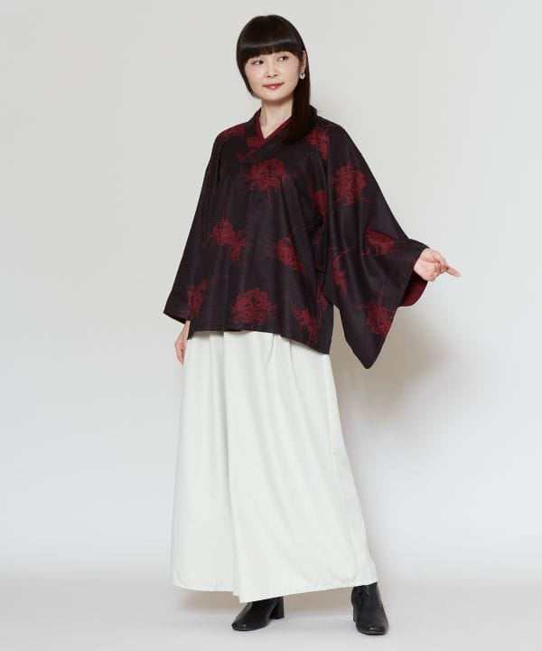 This top features boldly painted "Higanbana" "Bat," and "Pomegranate" patterns in contemporary colors. The kimono-like sleeves and collar are distinctive. Wear it with a skirt as a set-up for a stylish casual kimono look.