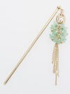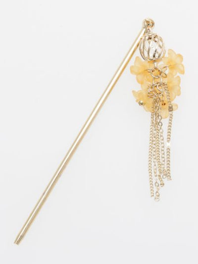 This metal hairpin has a collection of many small flowers with a soft frosted glass-like texture. The fringe of the chain that hangs down from the hairline gives it a feminine silhouette. The flower motifs are made of resin. <