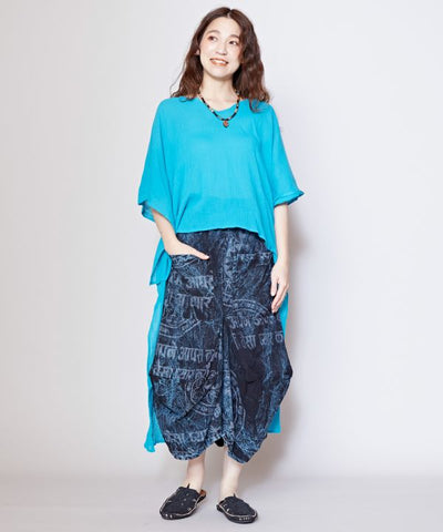 This versatile balloon skirt is printed with a constellation motif and acid-washed to give it a textured look. The unique silhouette with a sense of volume has an outstanding presence. Please enjoy the texture of the Nepalese-made material and the unique handmade texture of each piece.