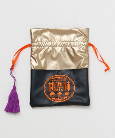 Drawstring pouch with embroidery inspired by proverbs. The metallic fabric gives it a modern look. It can be used not only as a small container but also as gift wrapping. With an outside pocket.