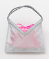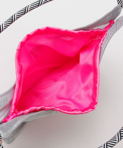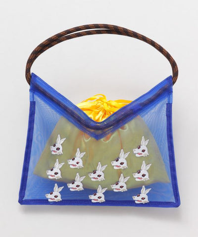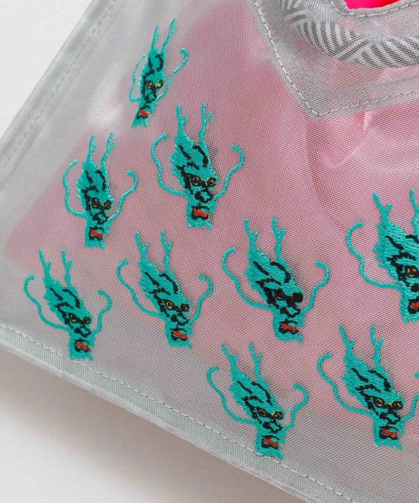 This mini bag is shaped like an azuma bag. It is embroidered with the popular "tiger" "dragon," and "rabbit" designs. The cool mesh fabric and the shiny drawstring give it a new look of different materials.