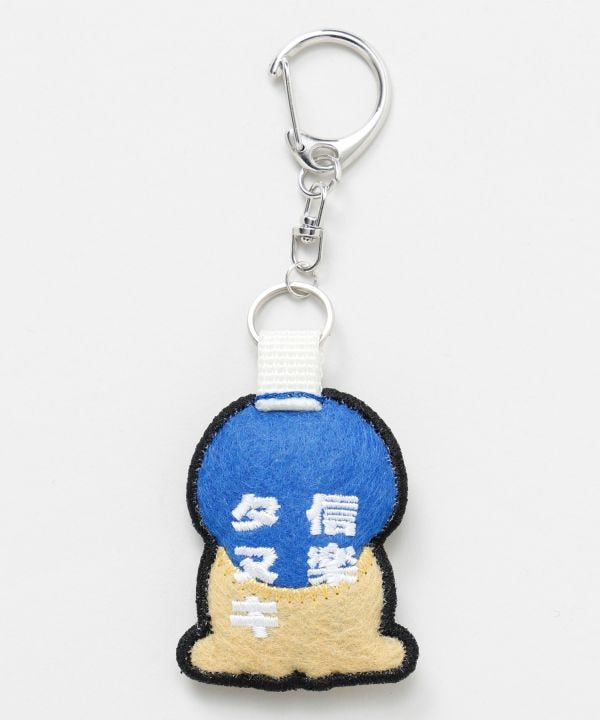 A keyholder featuring embroidered Japanese folk motifs such as daruma, maneki-neko, and traditional figures. Crafted with vibrant threads, each side offers a different design. The padded construction creates a soft, dimensional feel, adding a playful cultural accent to bags or keys.