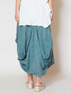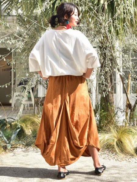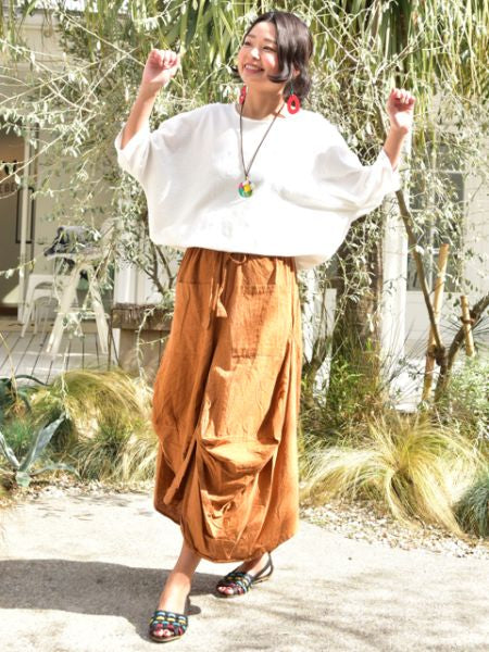 Nothing beats the comfort and texture of cotton. Acid-washed skirt with a voluminous shape. The unique silhouette makes this item the star of any coordinated outfit. Simple and easy to wear, this is a piece for all seasons. The waist is elasticized and the size can be adjusted with ties. Please enjoy the different texture of each piece.